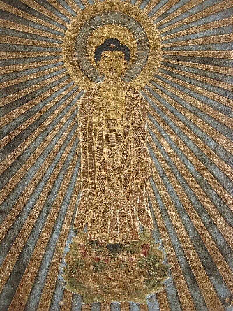 When he retreats to his cave, Asangha is determined to see Maitreya, but has no success for 12 years. It is significant that Maitreya is the Buddha of the future- it’s like Asangha is leaning into the future, grasping at a future version of himself. Perhaps it is this that is getting in the way of him being able to see Maitreya. This is one of those annoying problems of the spiritual life- we want to achieve enlightenment, make a breakthrough, but that wanting can itself be an obstacle. It is only when Asangha gives up, goes for a walk, and forgets himself in compassion for the dog, that Maitreya appears.